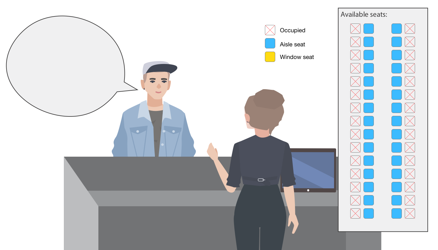 On the following pages, you will see a series of scenes with a customer and an airline representative, along with a map of the seats that only the representative can see: