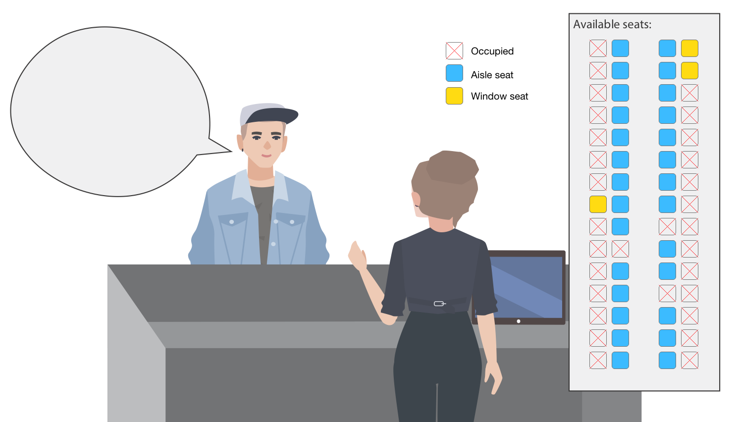 On the following pages, you will see a series of scenes with a customer and an airline representative, along with a map of the seats that only the representative can see: